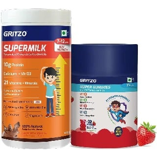 Gritzo SuperMilk Height+ for 7-12 Yrs Boy 400 g Double Chocolate & Gummies Multivitamin Combo