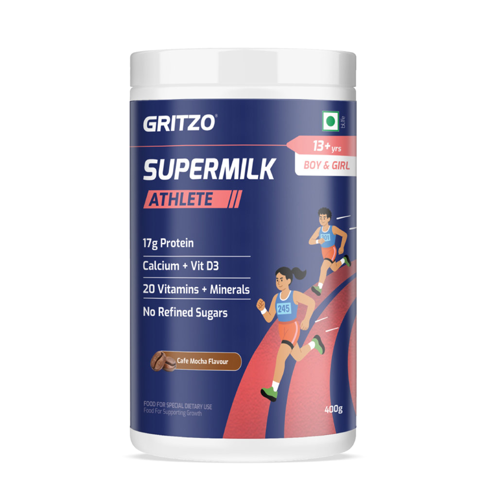 Gritzo Supermilk Athlete is specially formulated for active kids and young athletes to fulfil their daily nutrition needs and keep up with their active lifestyle. It's made in a delicious and natural Cafe Mocha flavour to strike the perfect balance between taste and nutrition, even for fussy eaters. With 17g protein, 20 vitamins & minerals, 100% RDA of Vitamin D3 and Calcium, it helps in growth and development, boosts immunity, and supports bone strength & energy.