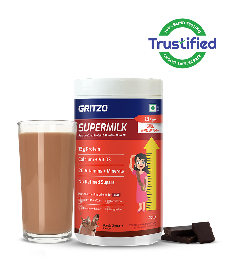 Gritzo SuperMilk Growth+ variant is specially designed for 13+ old girls to support healthy growth and development. It provides a unique blend of four-source protein, delivering 13g of high-quality protein per serve, along with 100% RDA of Vitamin D3 for stronger bones and better calcium absorption.