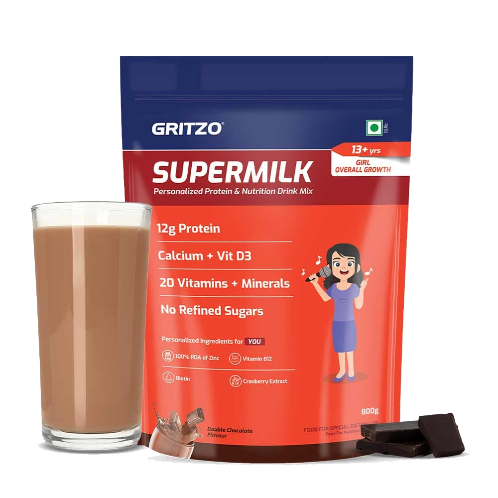 Gritzo SuperMilk is personalized by age, gender, and health goals to meet your child’s unique nutritional needs. The Overall Growth variant is specially designed for 13+ old girls to support healthy growth and development. It provides a unique blend of four-source protein, delivering 12g of high-quality protein per serve, along with 100% RDA of Vitamin D3 for stronger bones and better calcium absorption.